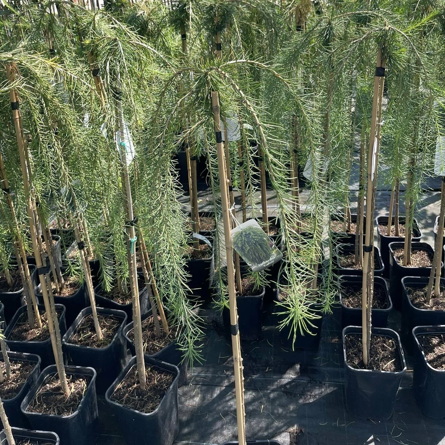 120 cm-es törzsre oltott tömött koronájú, csüngő fácska. Tűlevelei a törpe hajtásokon csomókban, a hosszú hajtásokon egyesével állnak, világoszöldek, ősszel sárgák és lehullanak. Tobozai lilásak, később barnák.