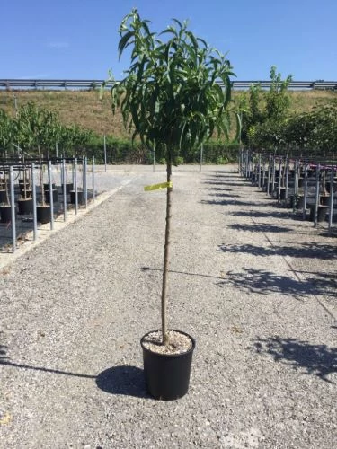 Erősen lapított gyümölcsei fehér húsúak, magvaválóak, akár a 10 dkg-ot is elérnek. Augusztus második felében érik. Öntermékeny.