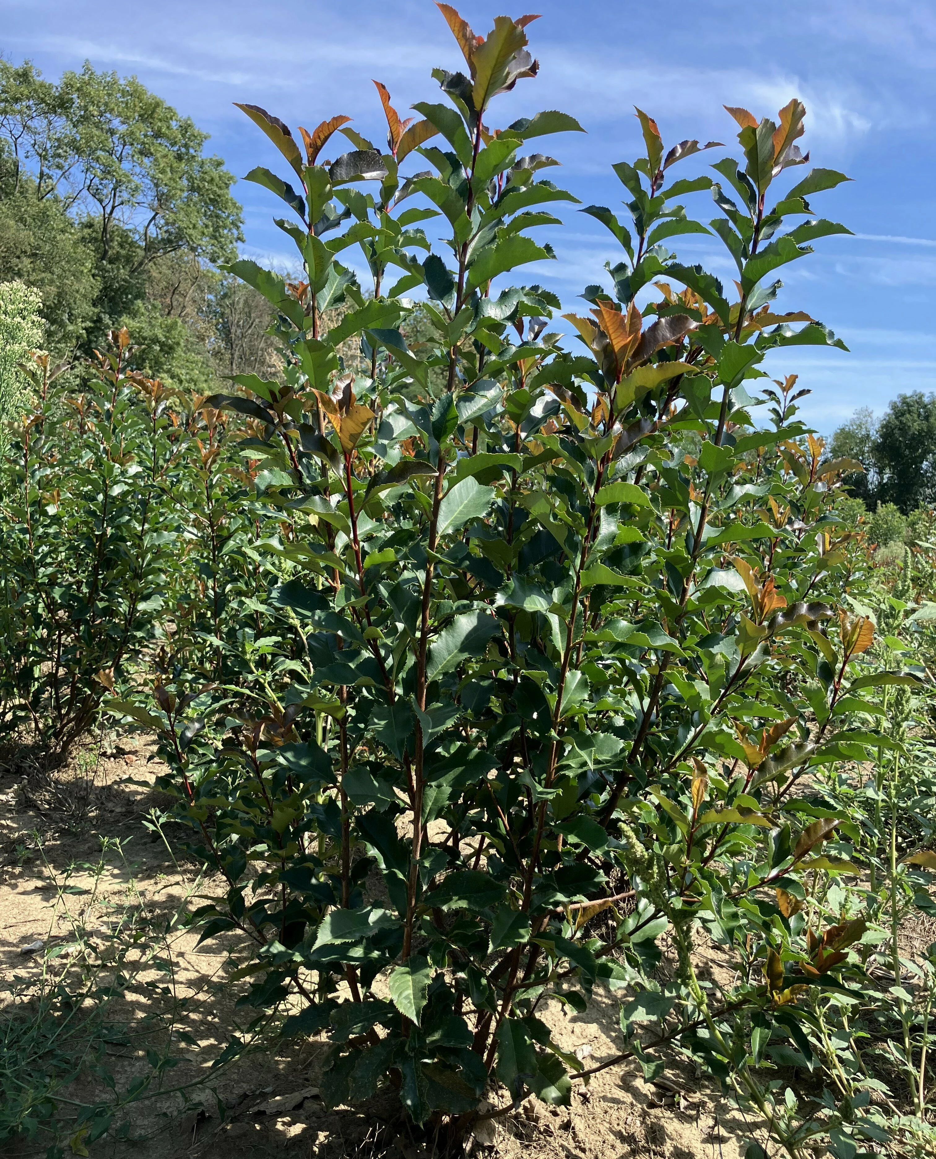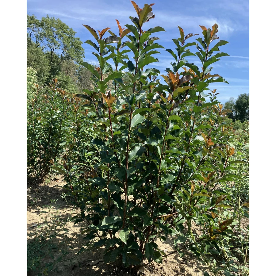 Örökzöld cserje. Fehér virágai laza fürtökben, májusban nyílnak. Friss hajtásain levelei mindig élénk vörösek. Talajra nem igényes, vízigénye közepes, napos helyen érzi jól magát. Alkalmas szoliternek, de sövény vagy formanövény is nevelhető belőle.