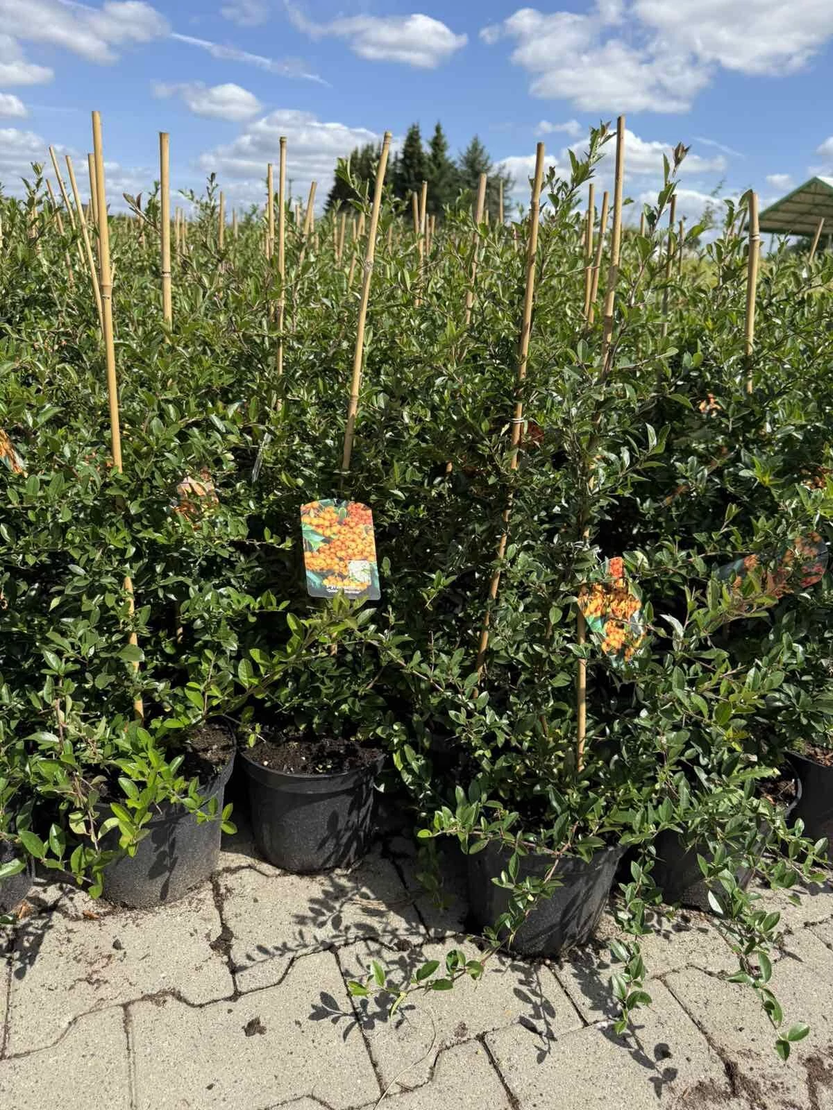 1,5-2 m magas széles bokrú örökzöld cserje. Termése aranysárga, bőven terem.